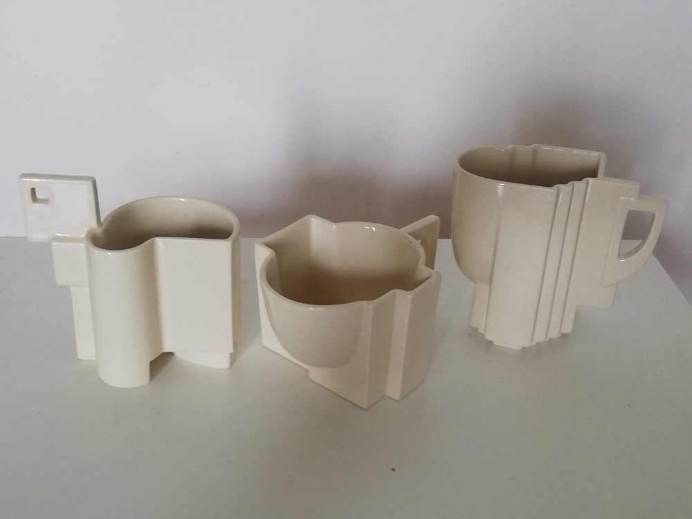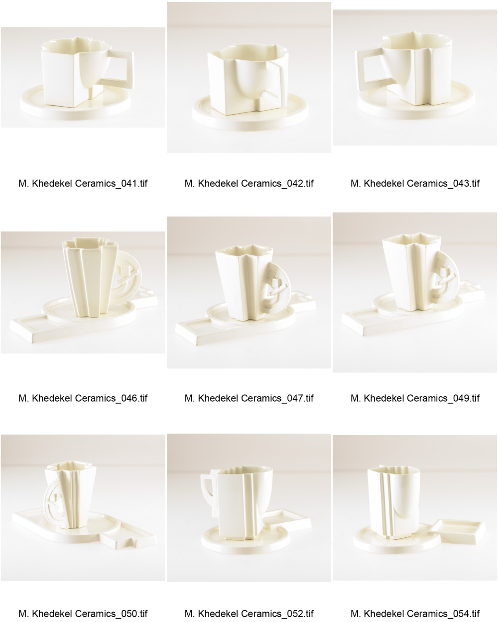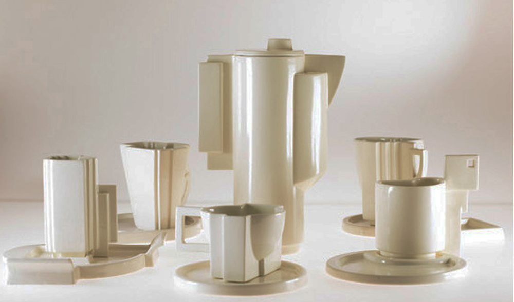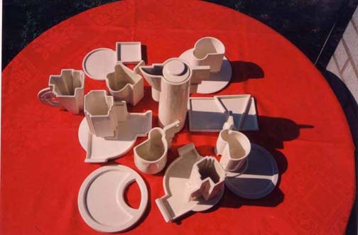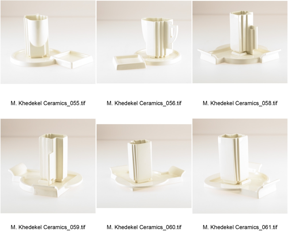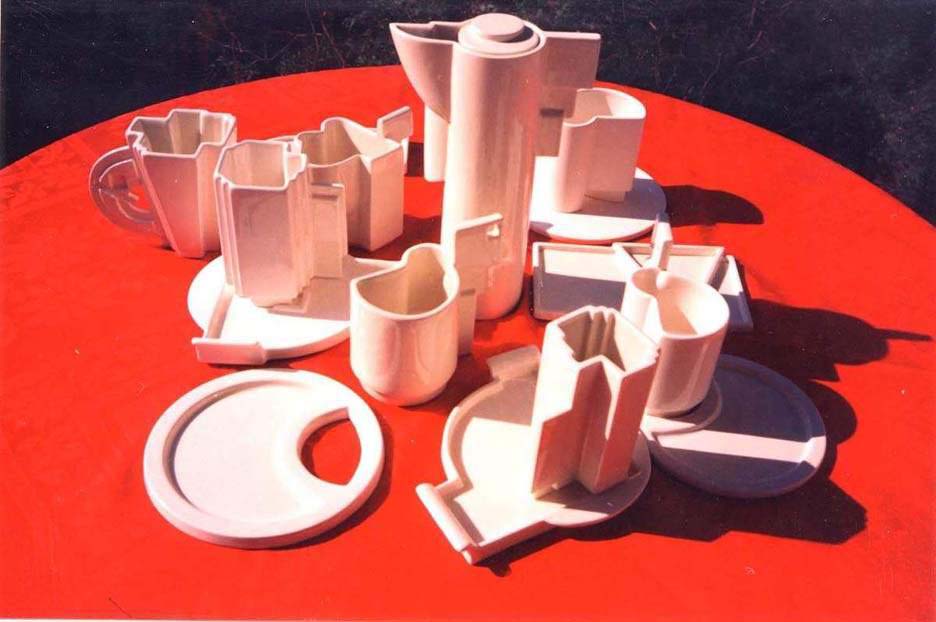 A different approach to the legacy of Suprematist porcelain was adopted by the Leningrad architect Mark Khidekel, who is the son of Lazar Khidekel. In the late 1980s, Mark Khidekel started working on a series of ‘Architectural Dishes’, employing the principles of Suprematist form-making that he had elaborated in his architectural designs of the 1960s – 1980s. He realized his designs at the Lomonosov Factory, and then in the United States, after emigrating in 1993. His dishes include Lazar Khidekel’s models of architectonic vases (also, as shown above, repeated by Suetin) and demonstrate a great diversity of forms, based on the harmonic relationships between round and rectangular modules. Mark Khidekel’s dishes are neither decorative nor utilitarian, but architectonic models, complementing his Suprematist tea-sets, which also act as small-scale models of a Suprematist environment.Mark Khidekel’s dishes are neither decorative nor utilitarian, but architectonic models, complementing his Suprematist tea-sets, which also act as small-scale models of a Suprematist environment.